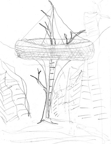 I was challenged to devise a nature watching station where visitors can perform research in close proximity to bird species native to Ithaca. Supported by tension wires, this hanging space is modeled after a bird’s nest. As is the case in this design precedent, feeding takes place in the center, where visitors can deposit birdseed in troughs. No angle limits observation due to windows lining the rotunda, and adjustable slats lie underneath, permitting natural cooling.