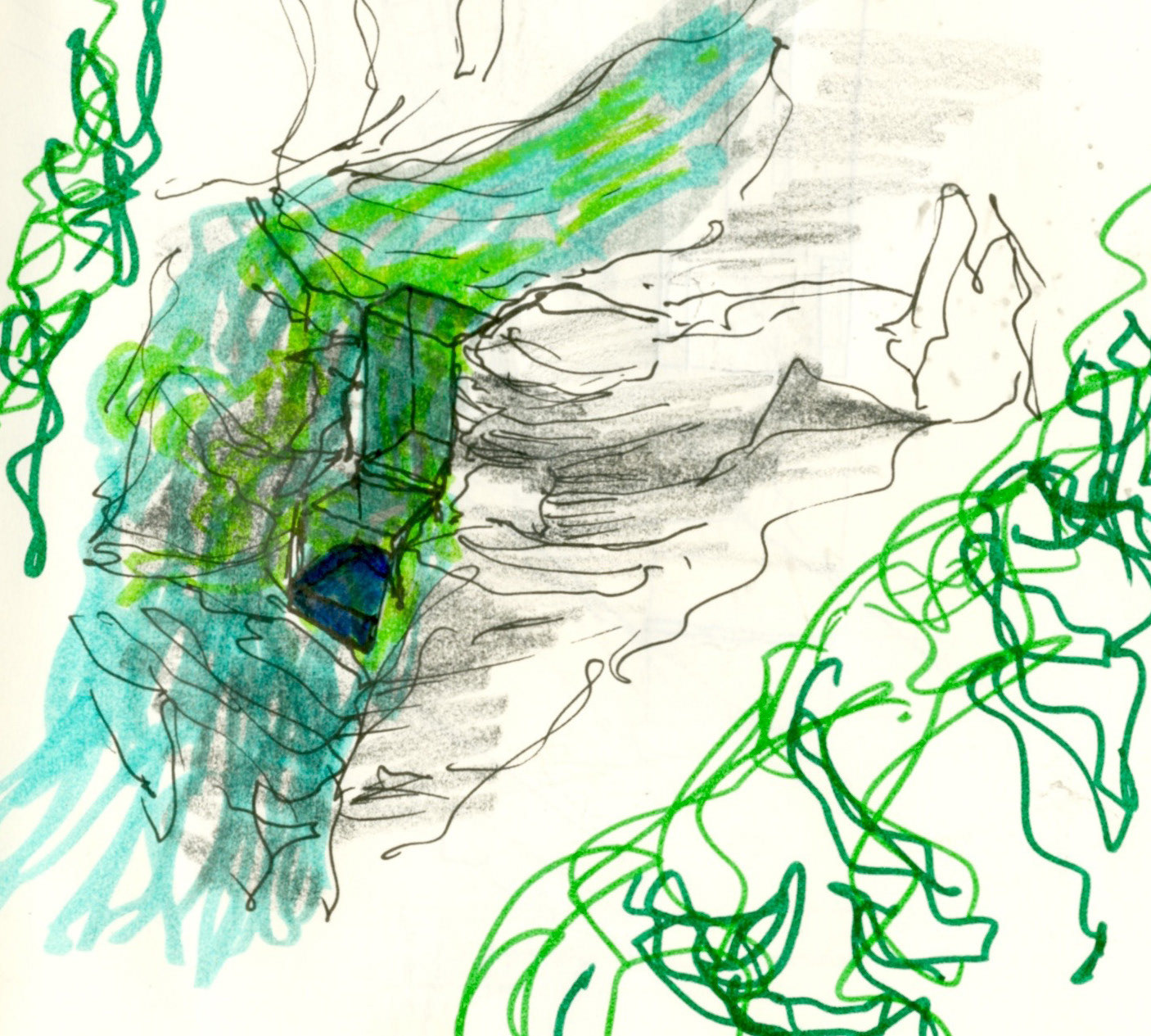 I conceived a sauna complex in Ithaca’s Willard Way site, which encompasses a local gorge. It is physically embedded into the side of the waterfall; the user, in turn, is embedded as well, and feels a powerful but peaceful engagement with the water, silt, and rock that surround him. Guiding one’s passage through the space are light trails established by glass panels contained within the walls that provide a direct route for light to travel through the water into the interior. The bath level is shielded by a waterfall curtain wall, providing an even more direct connection between the visitor and the elements.